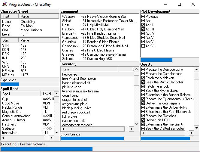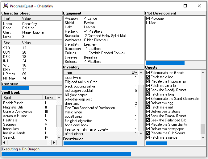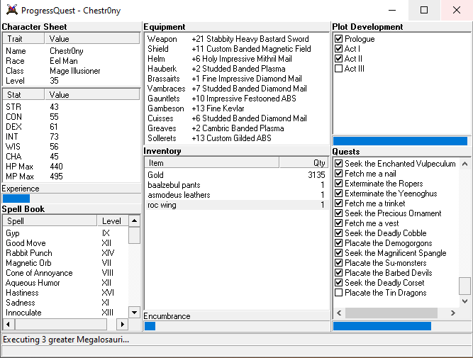 The way I “play” Progress Quest is firing up my save game on my office computer at 9AM and checking out my character’s progress since yesterday. Maybe he picked up a new +25 Merman Halberd as a quest reward, maybe he learned a new spell called Tonsilectomy or maybe he had a hell of a day delivering carrots while fighting leprechauns and looting their wallets. Then I minimize the game and leave it running in the background, going about my day and forgetting it even exists. Until the next morning, when the cycle begins anew. Or I forget about it for an entire week before it randomly pops back on my mind again and I resume my incredible non-interactive adventures.