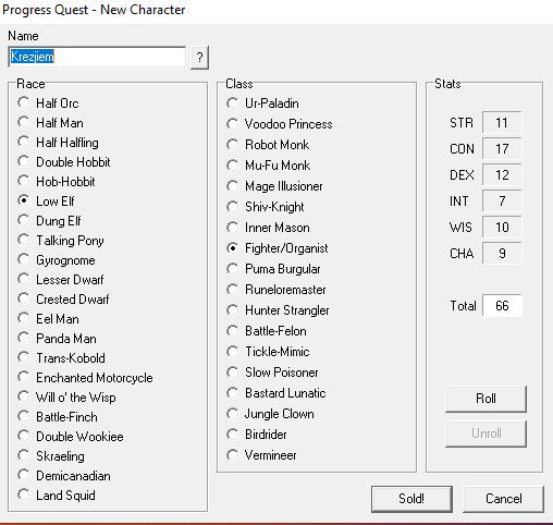 Enter Progress Quest, one man’s labor of love. Developed by Eric Fredricksen (aka Grumdrig) and released in 2002, Progress Quest is an RPG that plays itself. You begin by building your character by choosing from a number of ridiculously-sounding races and classes, pick a name for your avatar and then you’re off to your big adventure.